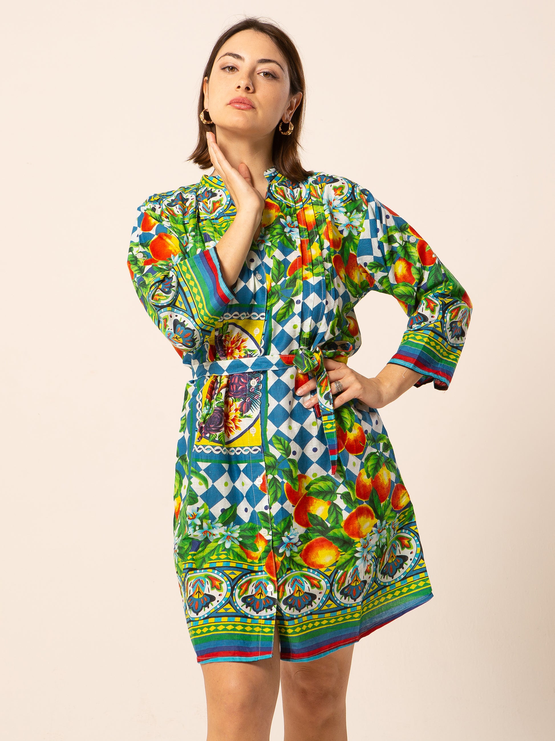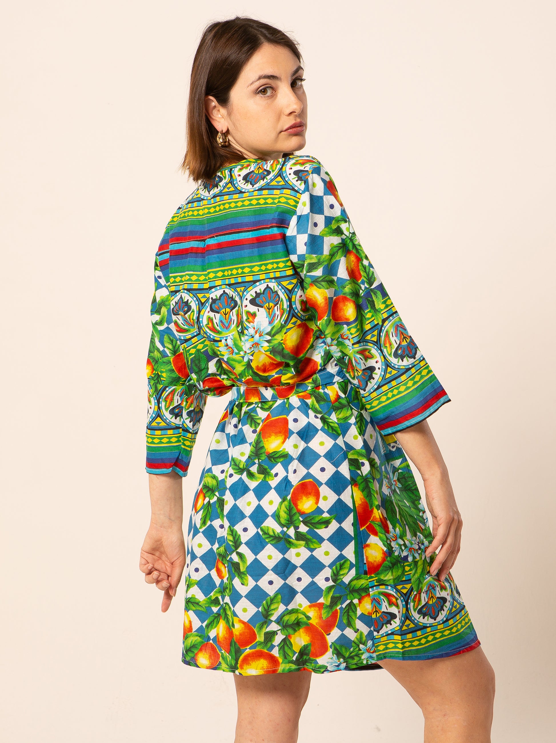 Questo abito rappresenta una scelta perfetta per quante amano vestire con colori e fantasie particolari. Può essere portato con scarpe basse, per un look più informale, oppure con sandali alti per aggiungere un tocco di eleganza