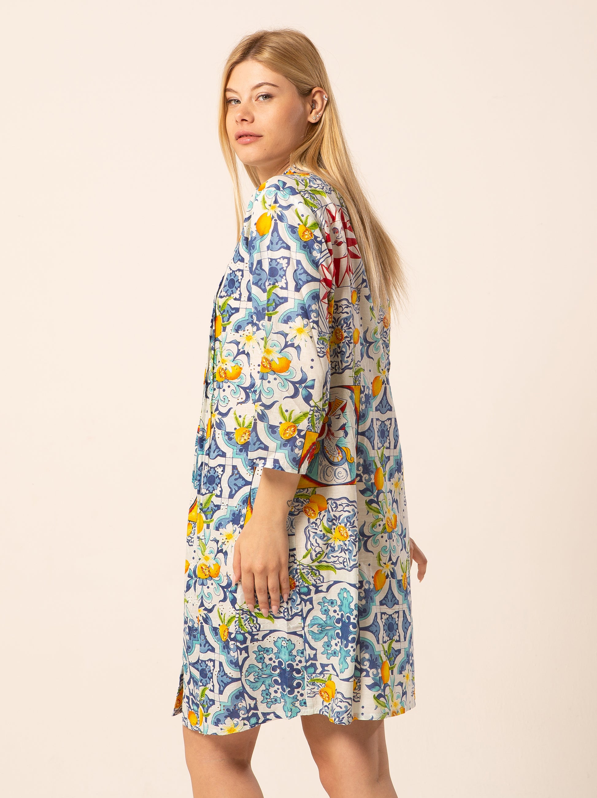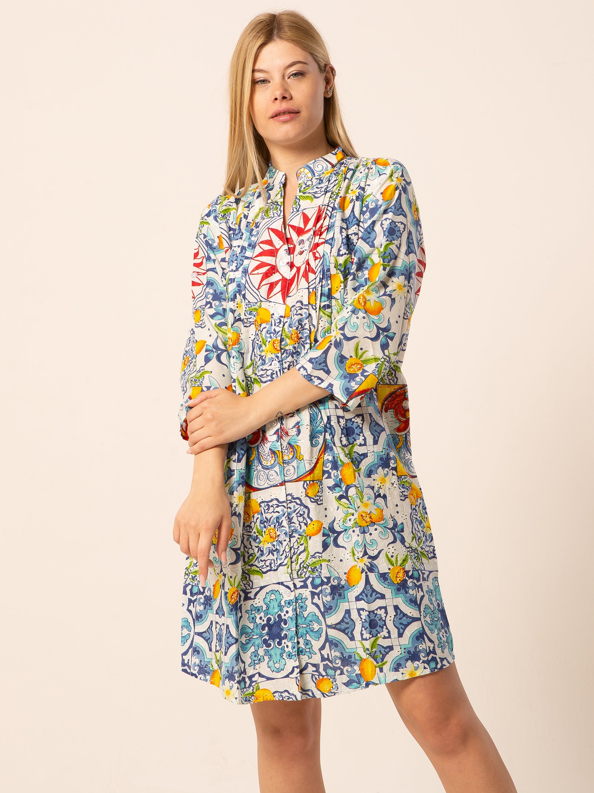 Questo abito rappresenta una scelta perfetta per quante amano vestire con colori e fantasie particolari. Può essere portato con scarpe basse, per un look più informale, oppure con sandali alti per aggiungere un tocco di eleganza