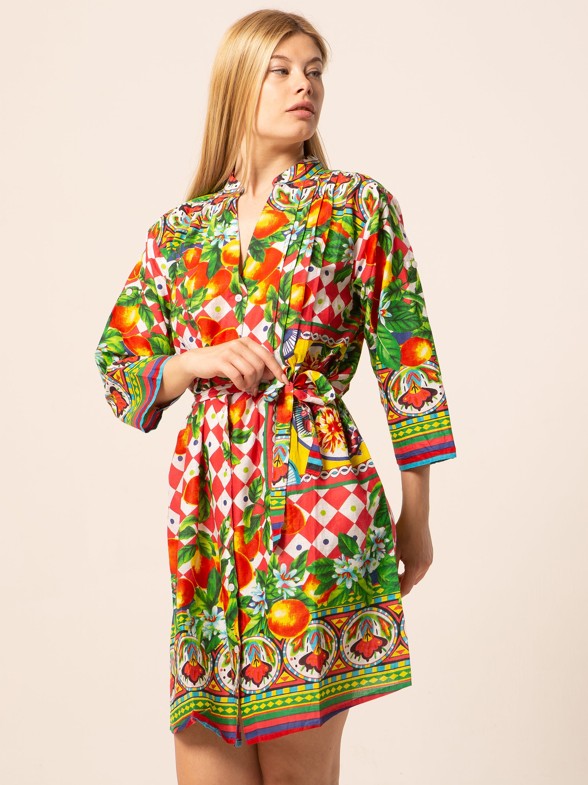 Questo abito rappresenta una scelta perfetta per quante amano vestire con colori e fantasie particolari. Può essere portato con scarpe basse, per un look più informale, oppure con sandali alti per aggiungere un tocco di eleganza