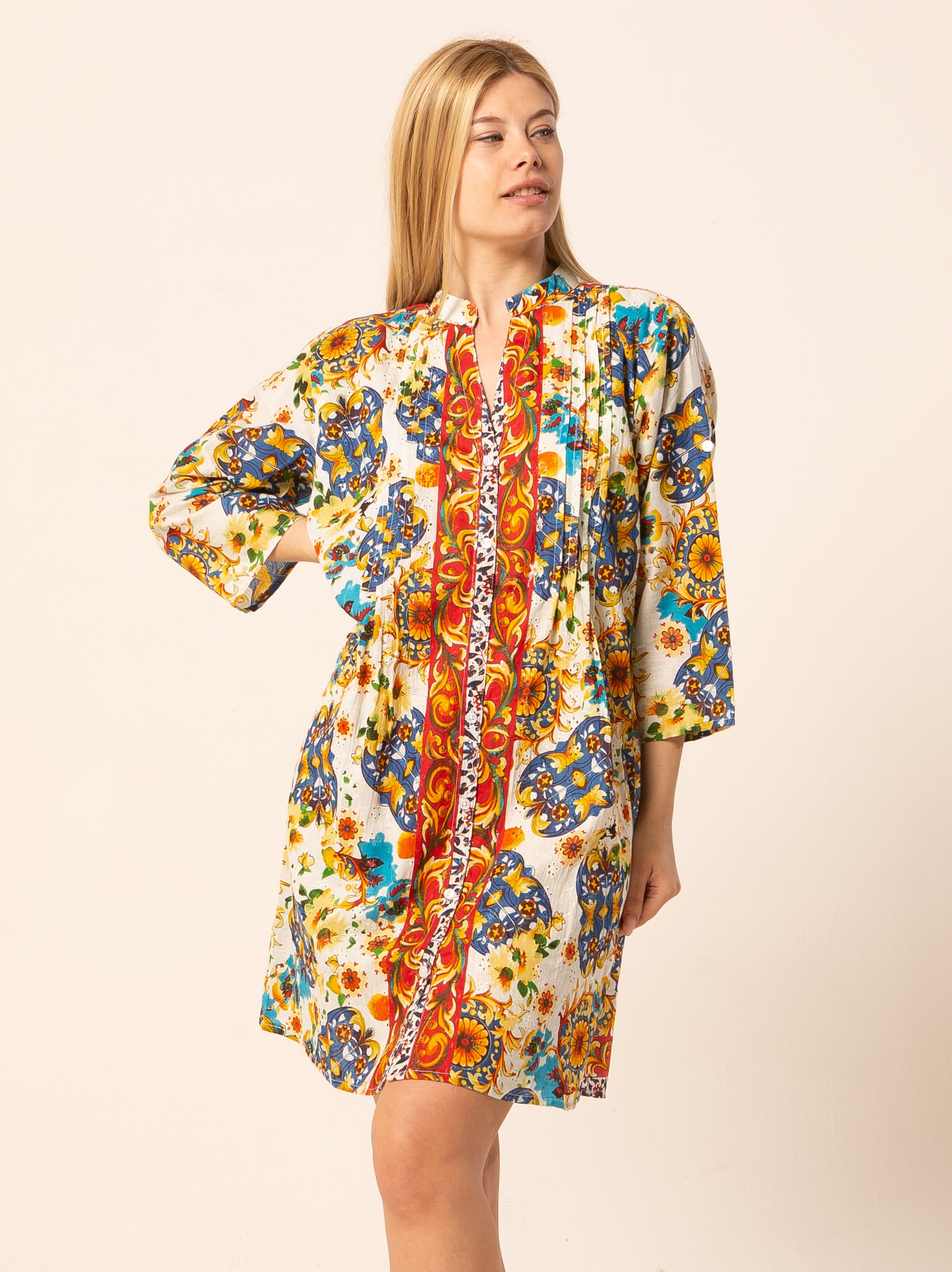 Questo abito rappresenta una scelta perfetta per quante amano vestire con colori e fantasie particolari. Può essere portato con scarpe basse, per un look più informale, oppure con sandali alti per aggiungere un tocco di eleganza