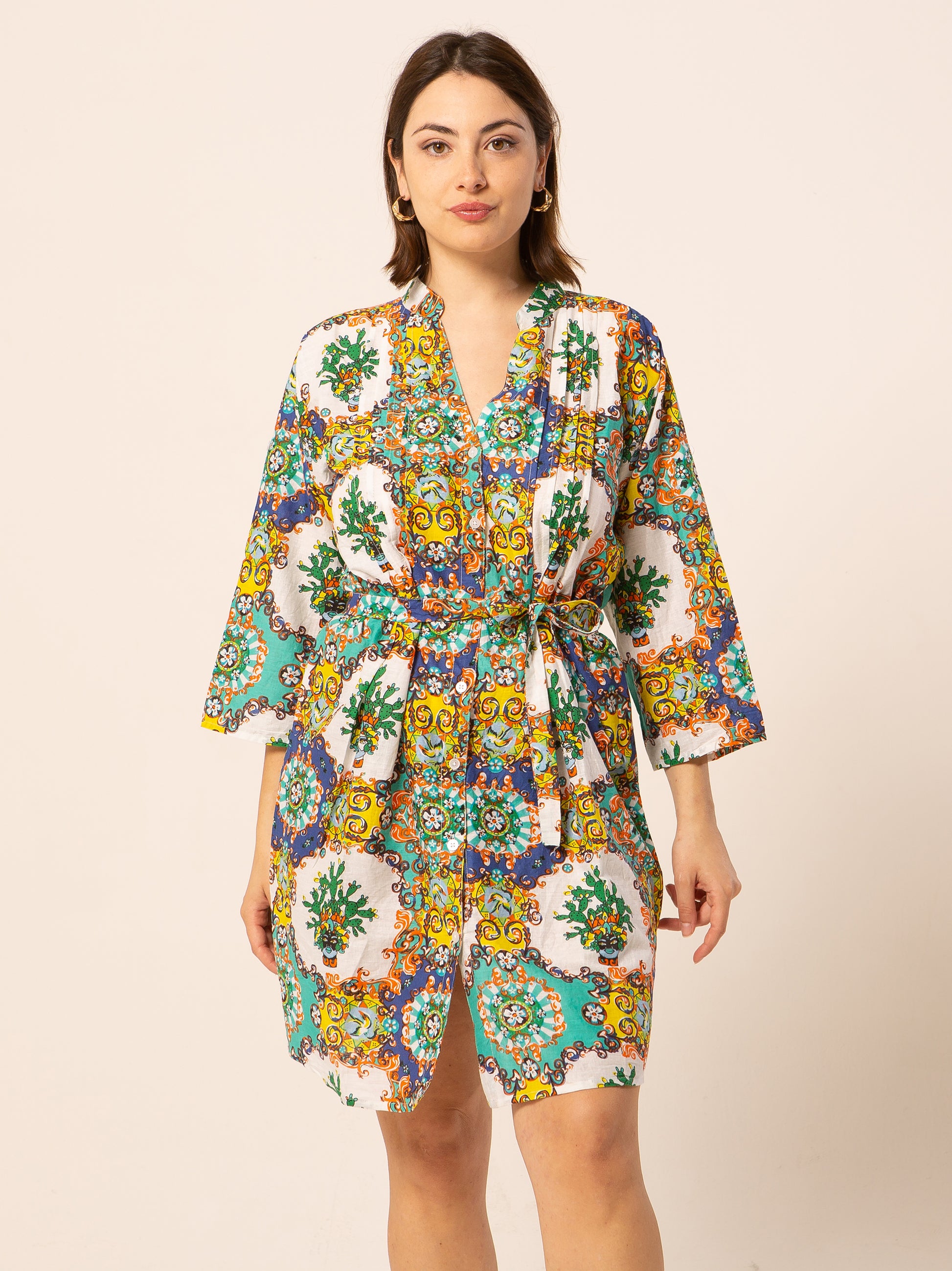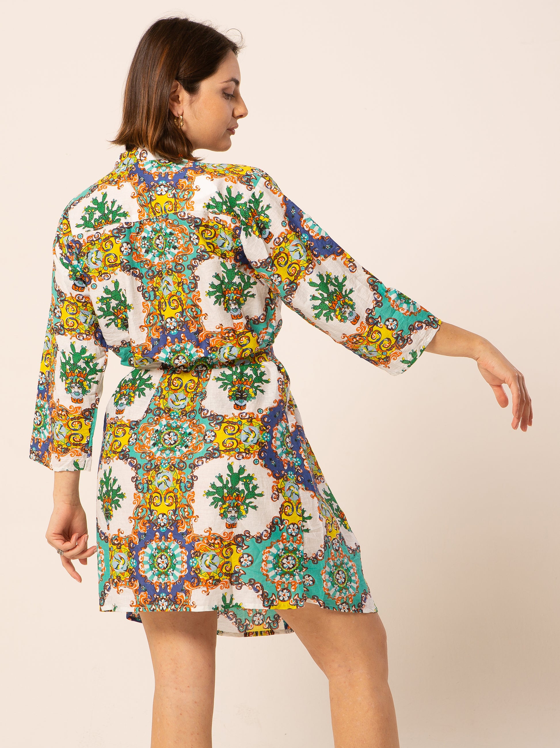 Questo abito rappresenta una scelta perfetta per quante amano vestire con colori e fantasie particolari. Può essere portato con scarpe basse, per un look più informale, oppure con sandali alti per aggiungere un tocco di eleganza
