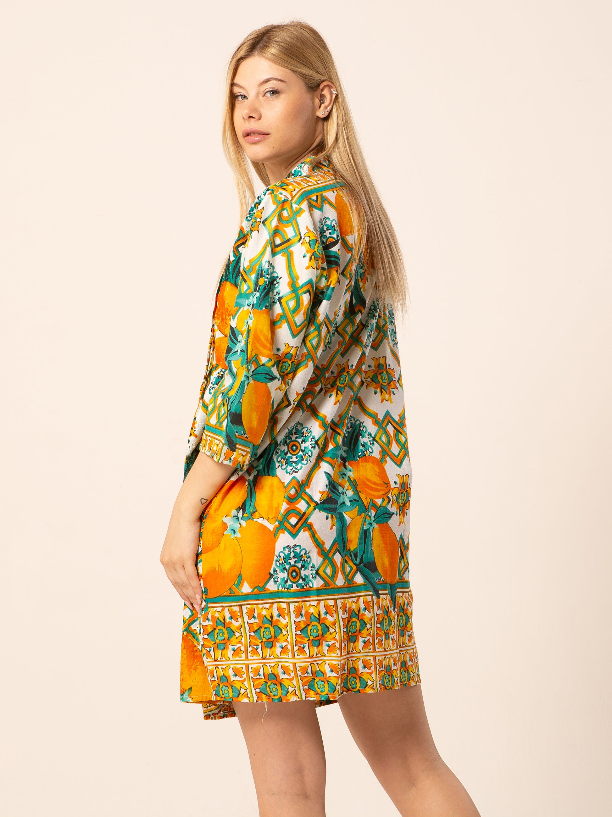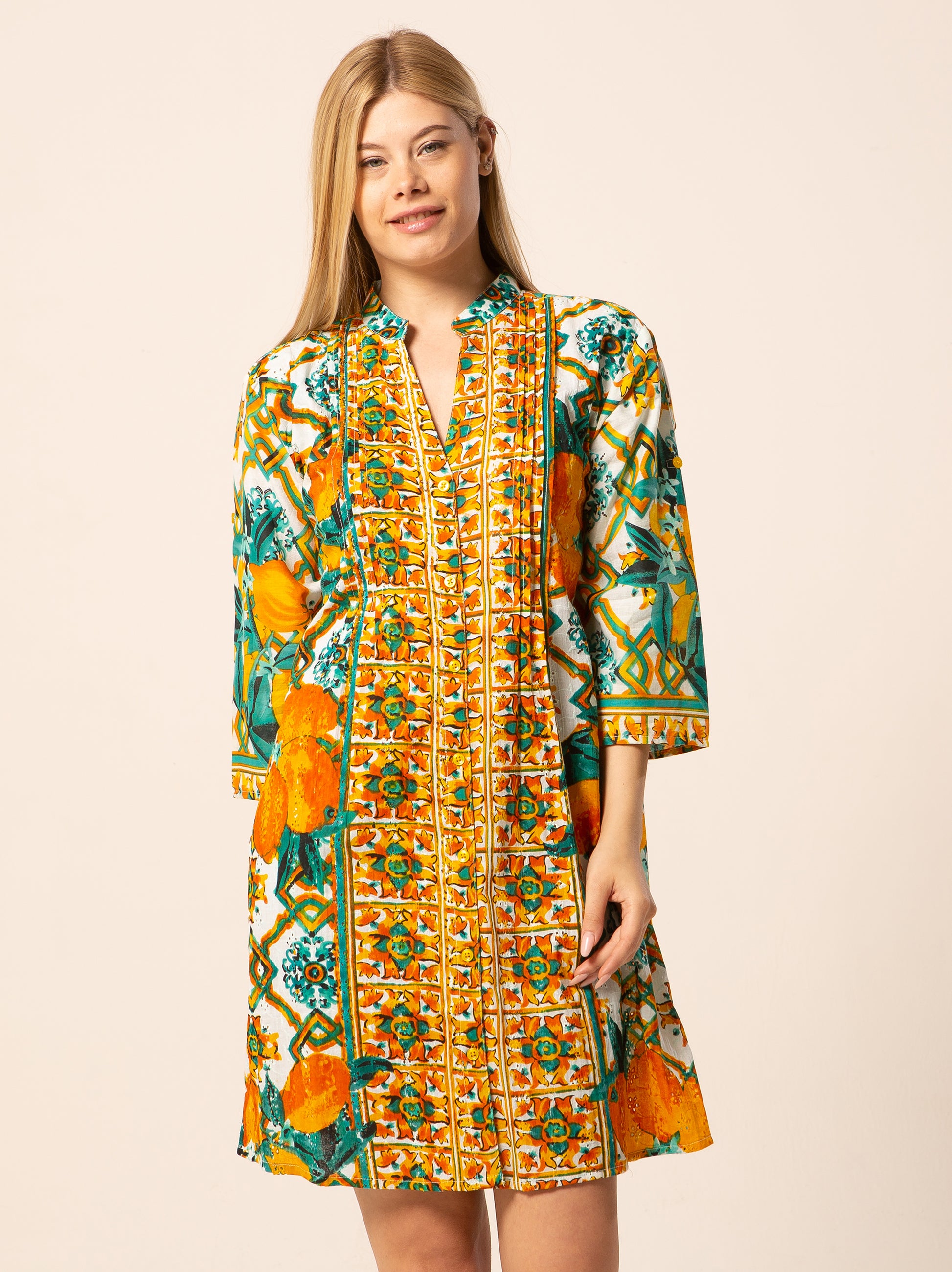 Questo abito rappresenta una scelta perfetta per quante amano vestire con colori e fantasie particolari. Può essere portato con scarpe basse, per un look più informale, oppure con sandali alti per aggiungere un tocco di eleganza