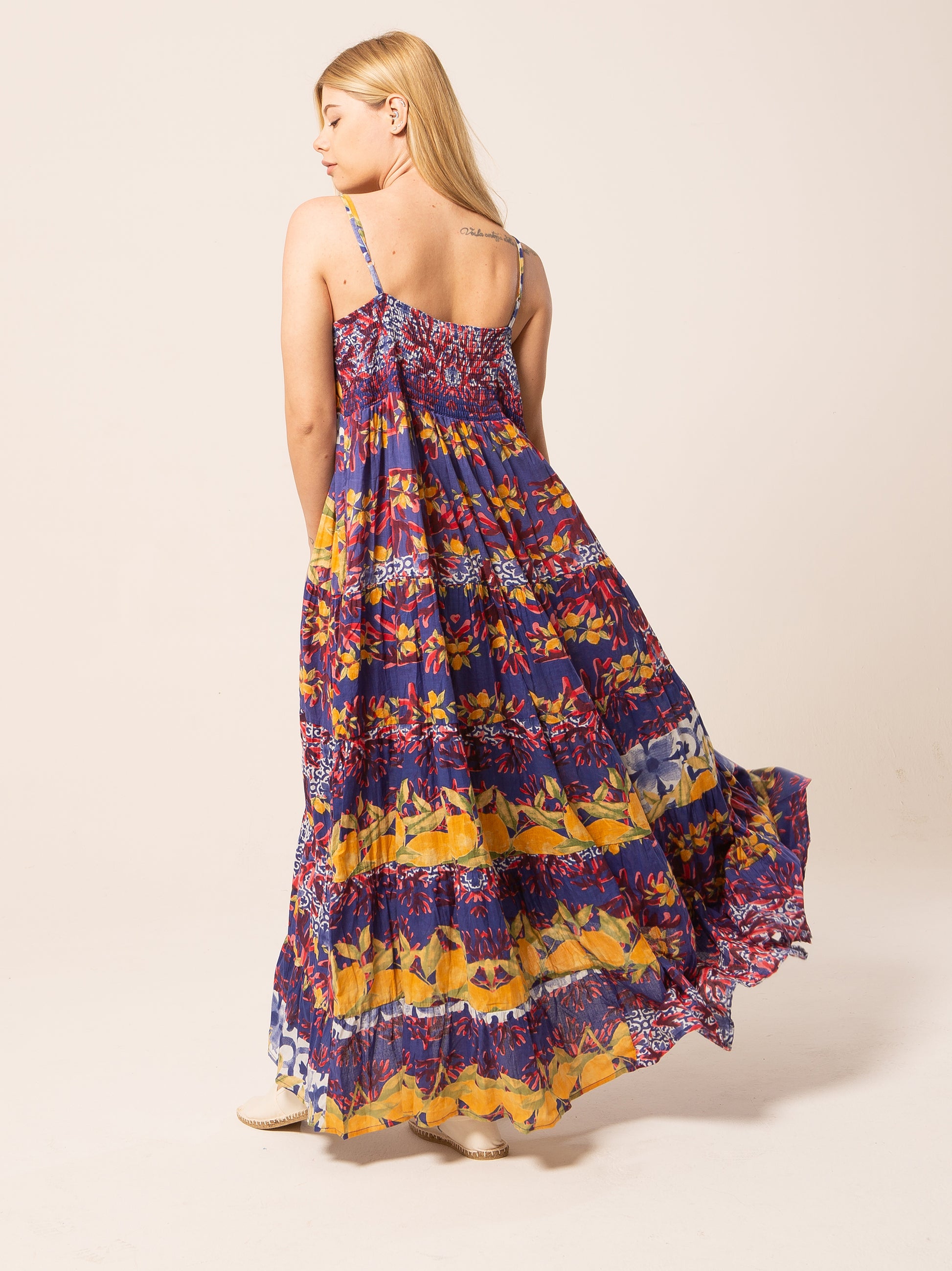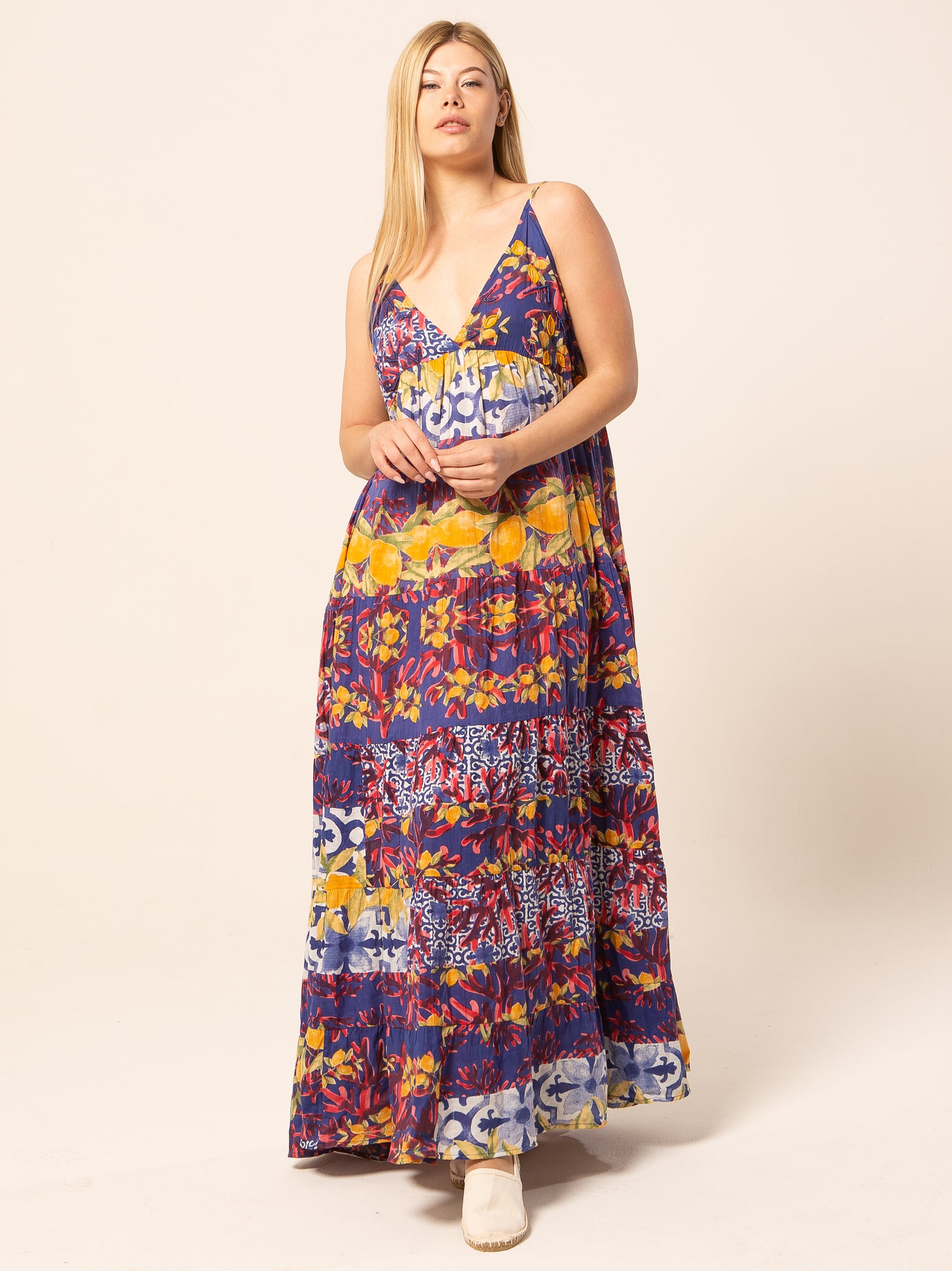 Questo abito rappresenta una scelta perfetta per quante amano vestire con colori e fantasie particolari. Può essere portato con scarpe basse, per un look più informale, oppure con sandali alti per aggiungere un tocco di eleganza